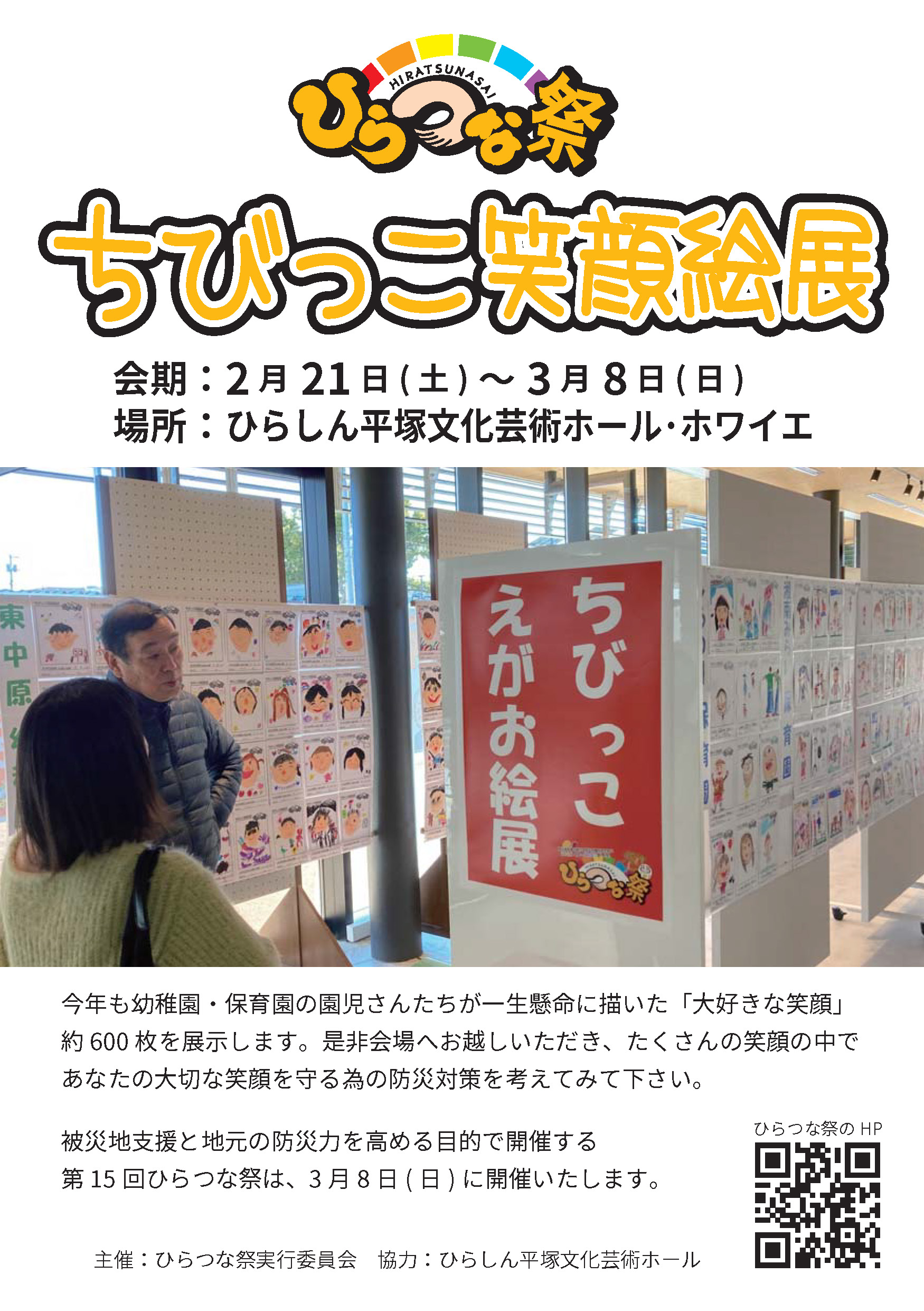 ちびっこ笑顔絵展、本日より展示 笑顔絵ギャラリー 2026.02.212026.02.21 今年も幼稚園・保育園の園児さんたちが一生懸命に描いた「大好きな笑顔」約600枚を展示します。 是非会場へお越しいただき、たくさんの笑顔の中であなたの大切な笑顔を守る為の防災対策を考えてみて下さい。 会期:2月21日(土)~3月8日(日) 場所:ひらしん平塚文化芸術ホール・ホワイエ 主催:ひらつな祭実行委員会 協力:ひらしん平塚文化芸術ホール 被災地支援と地元の防災力を高める目的で開催する第15回ひらつな祭は、3月8日(日)に開催いたします。