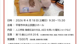 参加団体からの情報 赤十字救急法基礎講習 赤十字では、本日より下記講習会の応募受付を開始します。 ひらつな祭のステージデモで行った心肺蘇生法や、気道異物除去などの一次救命処置が学べる講習です。 『赤十字ベーシックライフサポーター』という資格も取れますので、もし関心がありました... 2026.03.09 参加団体からの情報